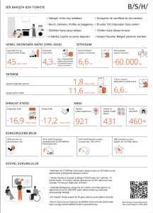 Türkiye’deki faaliyetlerinin 30. yılını kutlayan BSH Türkiye, istikrarlı büyümesi, ihracat gücü, sürdürülebilirlik taahhüdü ve sosyal sorumluluk projeleriyle ülke ekonomisine ve topluma değer katmaya devam ediyor. Bosch, Siemens, Gaggenau ve Profilo markalarıyla faaliyet gösteren BSH Türkiye, 5 fabrikası, gelişmiş lojistik ve servis ağı, 3.500’ün üzerinde satış noktası ve Türkiye’nin ilk sertifikalı Ar-Ge merkezi ile faaliyetlerini sürdürüyor.